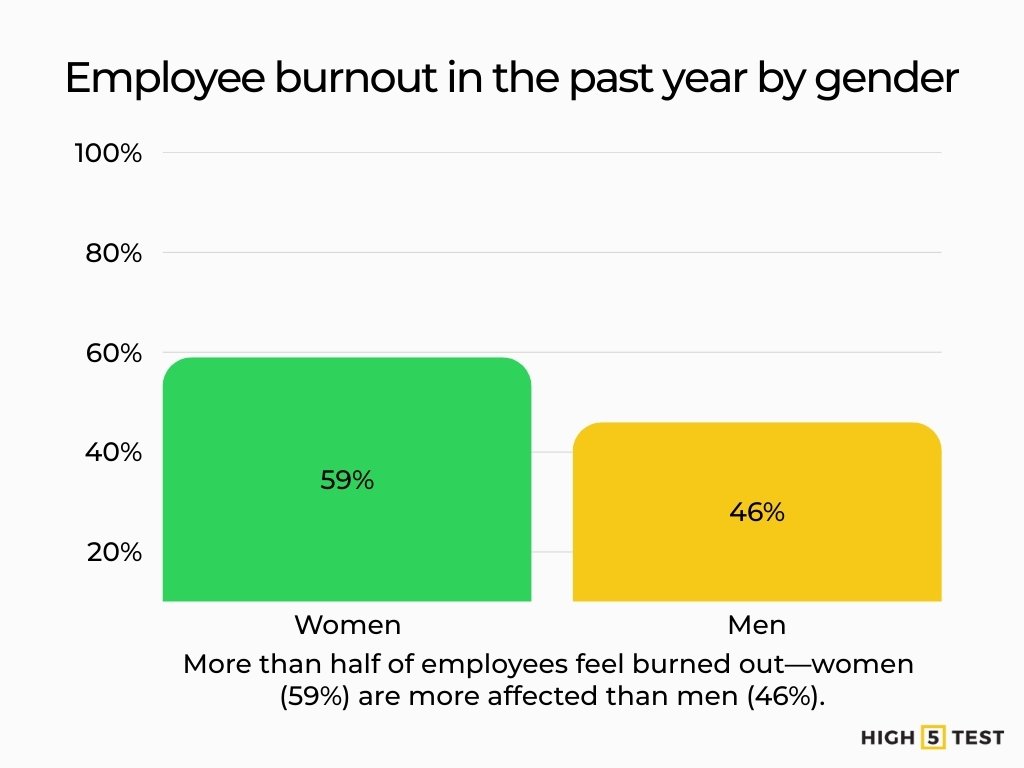 - Women: 59% vs men: 46% – gender gap in burnout. Female employees report burnout at a much higher rate than male employees, highlighting gendered pressures at work.