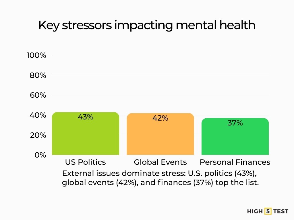 Top workplace drivers: Key stressors mentioned included U.S. politics (43%), global events (42%), and personal finances (37%). These factors highlight the interconnectedness of societal issues and individual well-being, illustrating how external circumstances can significantly impact people’s mental health and daily lives.