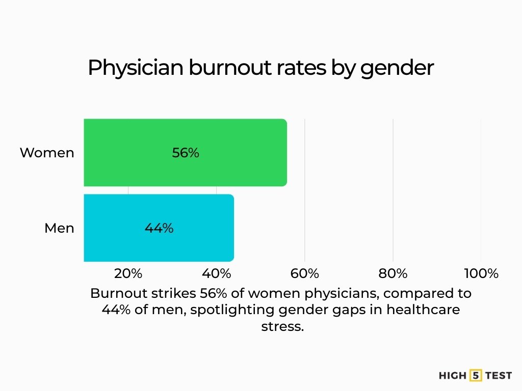 Physicians by gender: Women physicians 56% vs men 44% burned out. Women in medicine are especially vulnerable, facing both heavy workloads and systemic inequities.