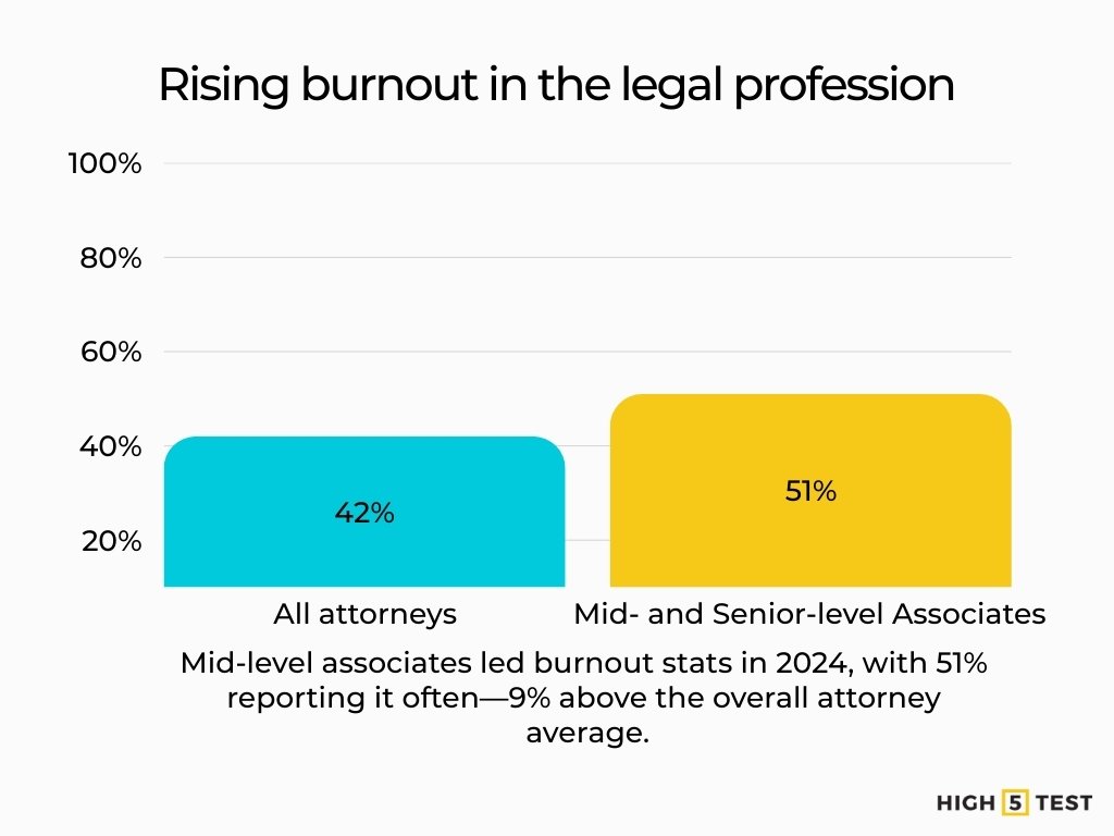 In 2024, attorneys reported experiencing burnout an average of 42% of the time, with mid- and senior-level associates feeling it most acutely at 51%.