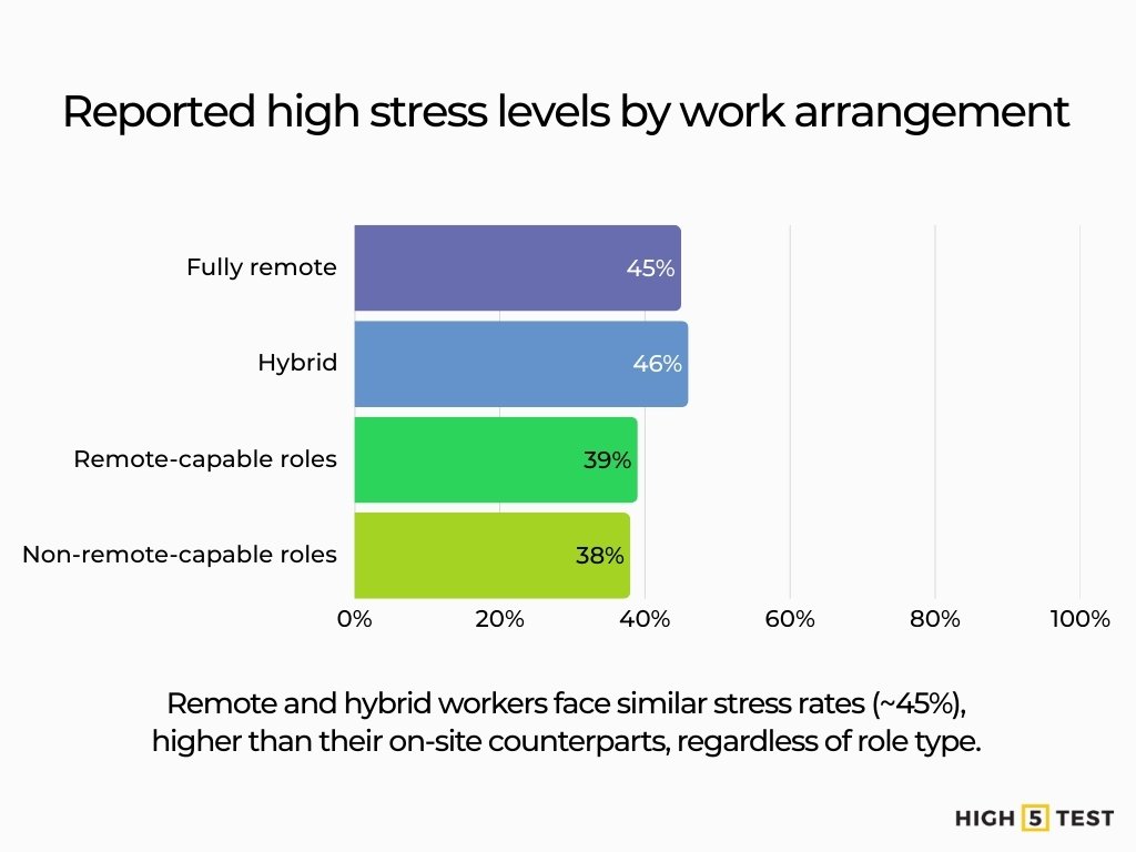 Remote vs hybrid vs on-site: Fully remote employees were more likely to report high stress on the previous day (45%) compared with on-site workers (39% for remote-capable roles and 38% for non-remote-capable roles), while their stress levels were nearly identical to those of hybrid workers (46%). Remote work doesn’t magically solve burnout, but bad management will cause it anywhere.